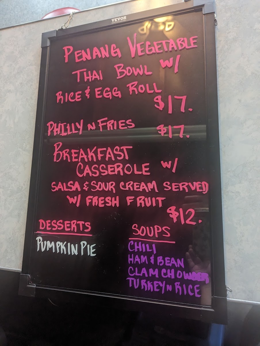 Desserts are where the menu truly broadens, showcasing a variety of baked treats that feel personal and homemade. Choices such as Peach Pie, Strawberry Rhubarb Pie, Blueberry Pie, and Coconut Cake highlight traditional flavors, while richer sweets like Carrot Cake and Bread Pudding, Cheesecake and Cinnamon Pastry, and the Cinnamon Roll Pastry cater to guests looking to end their meal on a comforting, indulgent note. Taken together, the menu presents a cohesive picture of a café focused on familiarity, generous portions, and classic flavors that are easy to enjoy and easy to return to.